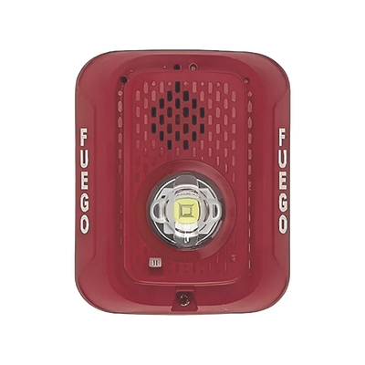 La P2RLED-SP combina una potente señal acústica con un estroboscopio sincronizable, cumpliendo con los estándares UL 1971 y UL 464. Su diseño compacto y moderno facilita la instalación, mientras que su carcasa en color rojo y la inscripción “FUEGO” en español proporcionan una alerta visual inmediata en zonas de habla hispana.